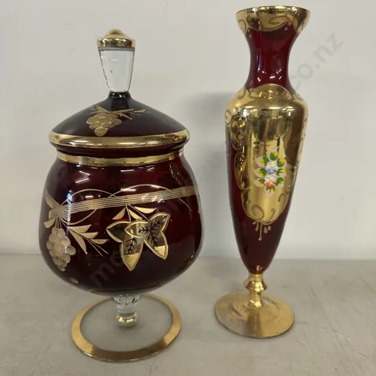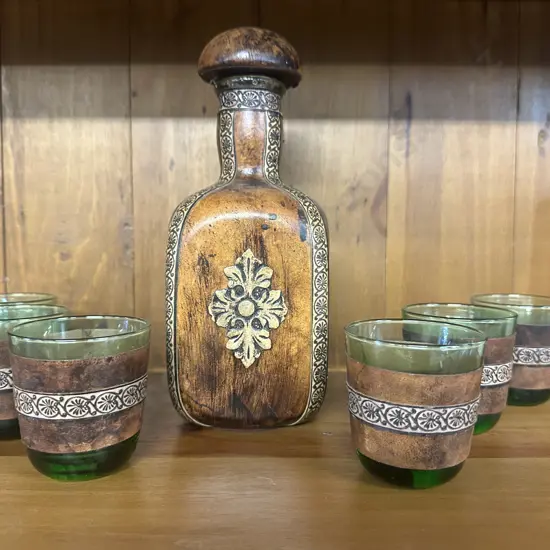 Decorative Italian Wooden Decanter & Six Green Tumblers