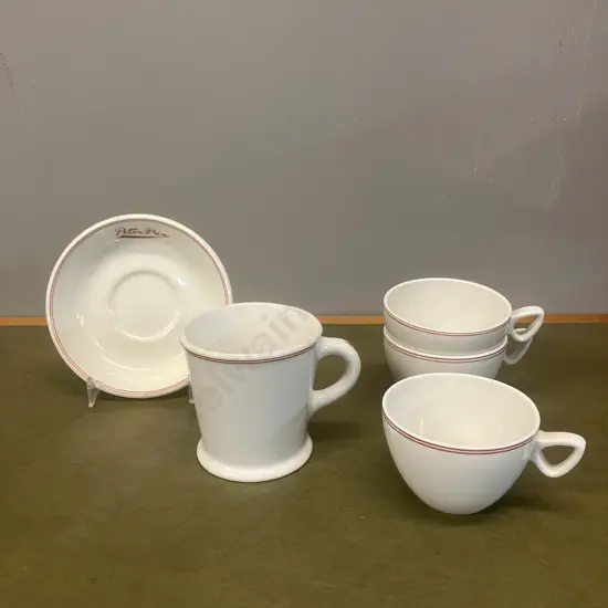 Vintage Crown Lynn Mug & Three Cups Hotel Ware - Vitrified White With Two Red Stripes (1960s)