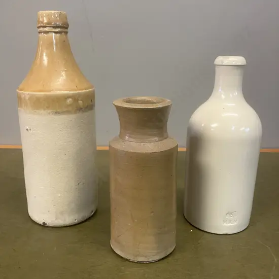 Antique Victorian Stoneware Bottle, Antique Ginger Beer Bottle & Beer Bottle Stamped M.K.M 0.5L, H24, 20 &16cm