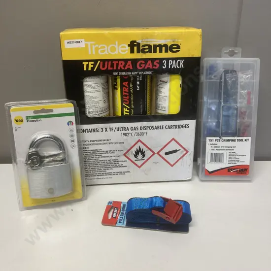 Tradeflame TF/Ultra Gas 3 Pack Disposable Cartridges, Crimping Tool Kit, Grunt Pull Tie-Down, Yale 70m Padlock