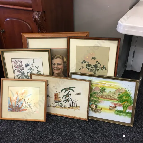 Assorted Framed Artworks, Queenslander, Star Fish Etc In Black Basket
