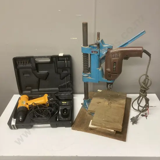 Colt 12V Cordless Drill Set In Case, Hitachi Electric Drill & Wolf Drill Press
