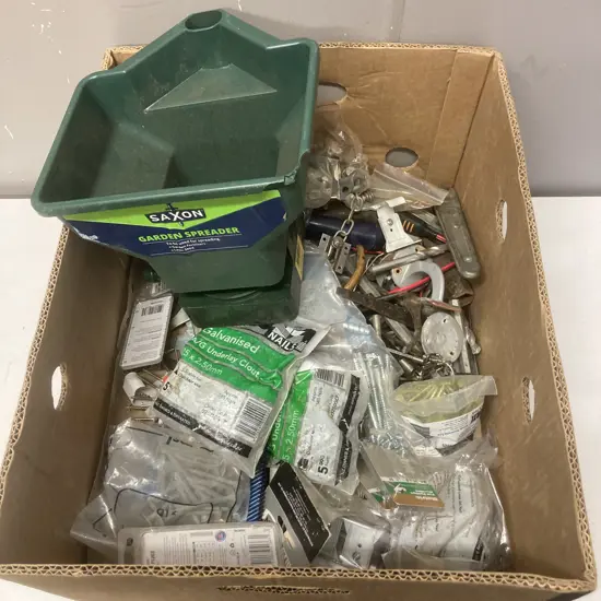 Box lot Saxon Garden Spreader, Hand Tools, Hardware Etc