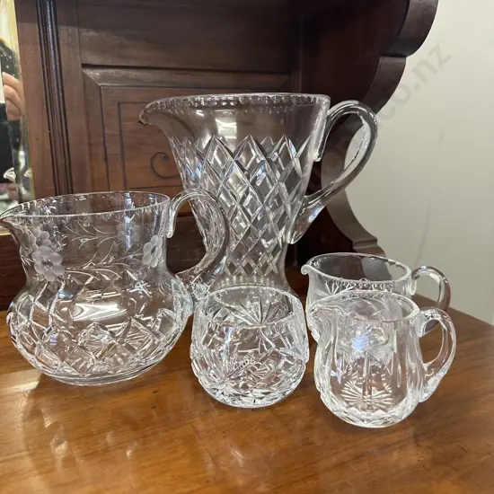 Selection Of Vintage Crystal Ware Including Large Drinks Jug (af) Creamers, Sugar Bowl Etc