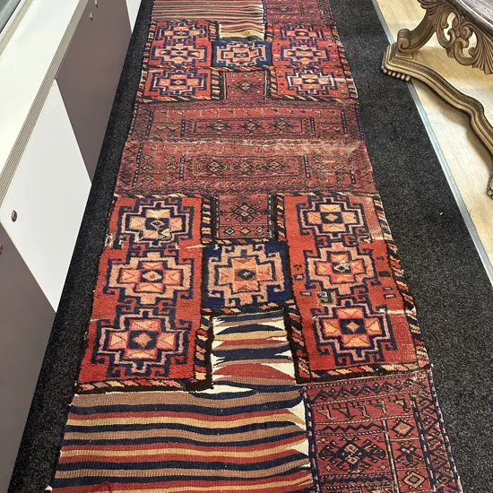 Floor Runner Red/Navy/Cream Patchwork Detail L273,W100cm.