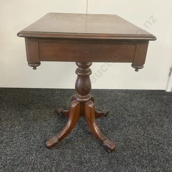 Victorian Antique Side Table, Single Drawer, Turned Pedestal To 4 Carved Feet On Castors. H74 W76 D50cm