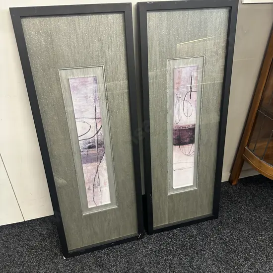 Pair Of Black Rectangular Framed Abstract Wall Art Light Pink & Purple Tones H105,W39cm.