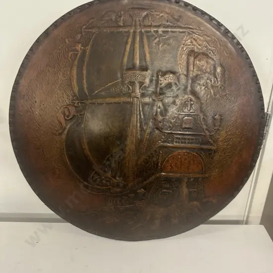 Round Vintage Oak Leather Domed Artwork Dia58cm.