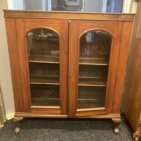 Victorian Antique 2 Door Display Cabinet / Bookcase With Key, 2 Wooden Shelves, Ball & Claw Feet. H130 W115 D30cm